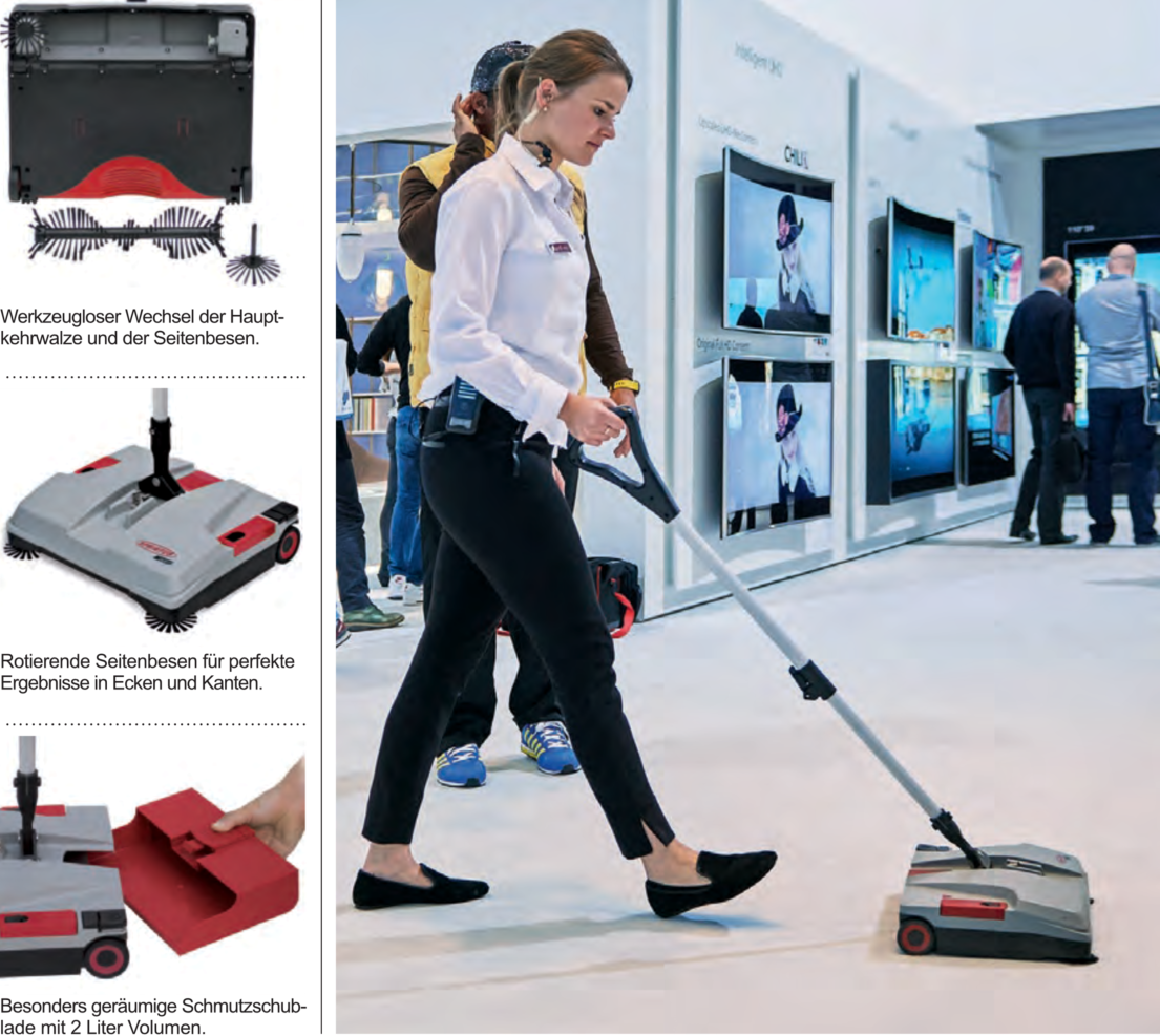 Gewerbliche Akkukehrmaschine für die schnel-le, kabllose und leise Zwischenreinigung aller Oberflächen, In-