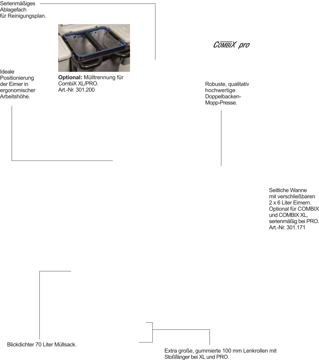 Für die Flur-, Zimmer- und Badreinigung in öffentlichen Einrichtungen, Büros, Hotels, Pensionen. Farblich getrennte Wischeimer und Halterung für Wäsche-/ Müllsack.Der Reinigungswagen in Profiqualität besteht aus zwei robusten Kunststoff Bodenplatten, wobei die hintere Ablage je nach Bedarf abgenommen werden kann. Die stabilen Metall-Lenkrollen und die großen, gummierten Hinterräder erfüllen die Anforderungen für den täglichen, Einsatz. Der Deckel über dem Wäsche-/ Müllsack kann bequem vom ergonomisch geformten Schubbügel aus bedient werden. Ein Mopp oder Besen kann sicher im integrierten Halter fixiert werden. Für das Warnschild ist eine gesonderte Halterung am Rahmen integriert. Serienmäßig wird der PuriX mit vier Eimern, einer seitlichen Moppablage, geräumigem 120 Liter Wäsche-/Müllsack und einer Doppelbacken-Mopp-Presse ausgeliefert. Am Wagen kann eine Medusa Akkukehrmaschine mitgeführt werden.