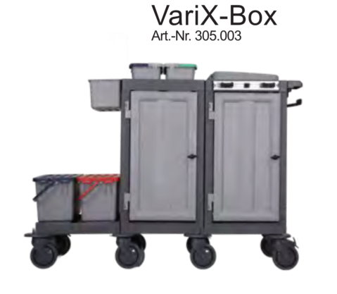 Mit insgesamt drei qualitativ erstklassigen Ausführungen des geschlossenen Reinigungswagens VariX, bieten wir maximaen Nutzen und höchste Hygienestandards für den täglichen Einsatz im Gesundheitswesen und in HoReCa-Bereichen. Die modulare Bauweise ist vielfältiger denn je und ermöglicht für jeden Anwendungsbereich die passende Lösung. Die glatten und einfach zu reinigenden Oberflächen sowie geschlossene Hygienerollen, Eimer und Mopp-Boxen, ermöglichen den Einsatz auch unter Einhaltung von höchsten Hygienevorschriften. Die abschließbaren Türen sorgen für maximale Sicherheit im Objekt. Große, ausziehbare Schubladen bieten ein hohes Ladevolumen. Die großen 150 mm Lenkrollen überwinden mühelos Schwellen und garantieren auch bei voller Beladung einfaches Manövrieren. Die VariX - Reihe ist ein verlässlicher Partner zu einem hervorragenden Preis-Leistungs-Verhältnis und einem hohen Maß an Wirtschaftlichkeit.