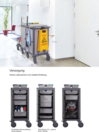 Verschließbarer Reinigungswagen in zwei Ausführungen.Der Matrix, wahlweise mit Mopp-Presse oder Mopp-Boxen, besticht durch perfekte Verarbeitung, eine äußerst solide und robuste Bauweise, sowie ein hervorragendes Preis-Leistungs-Verhältnis.Der extra große Innenraum verfügt über drei ausziehbare Wannen und ein Ablagegitter und bietet vielseitigen Stauraum für die Aufbewahrung von Reinigungsmittel oder andere Utensilien. Die abschließbare Türe gewährleistet maximale Sicherheit im Objekt und garantiert jederzeit ein modernes und dezentes Erscheinungsbild. Dank der großen gummierten 100 mm Lenkrollen, lässt sich der Matrix auch bei voller Ladung jederzeit mühelos und sicher bewegen. Die	hinteren Lenkrollen verfügen über zwei einzeln arretierbare Feststellbremsen und sichern den Matrix beim Abstellen vor ungewolltem Wegrollen.
